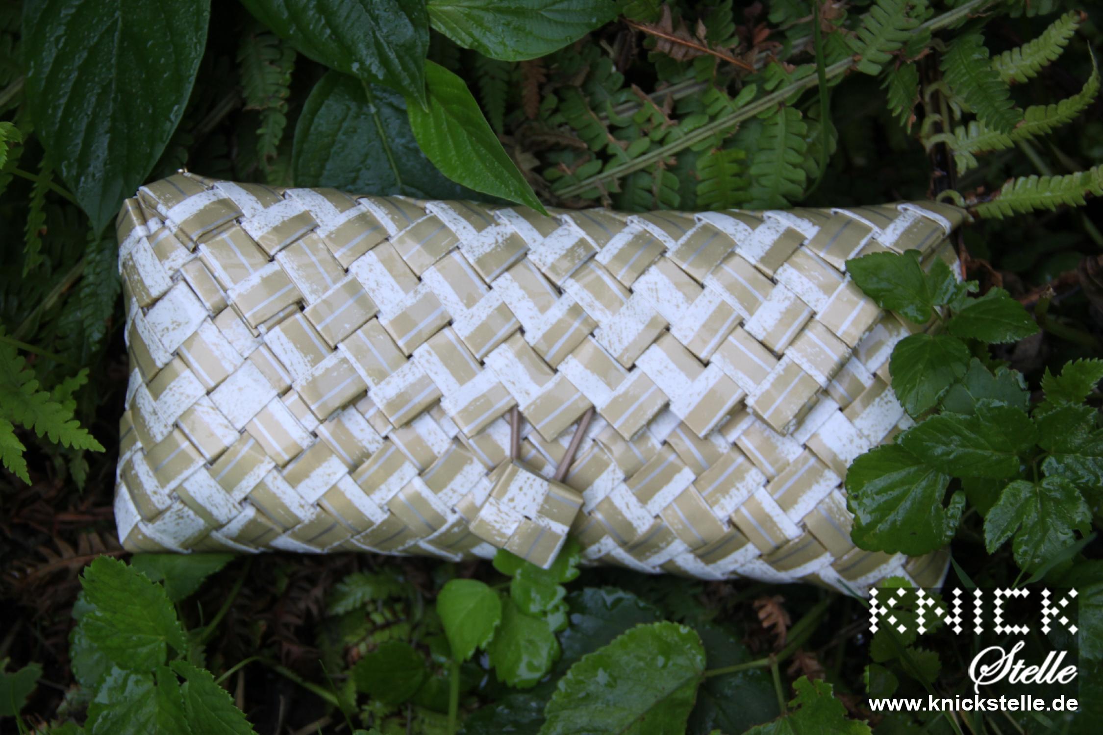 Klassisch und elegant ist diese Clutch aus weiß-gold gestreiftem Papier. Sie hat eine goldene Trägerkette.