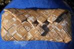 Braunes Packpapier mit einem weißen Druck von Geschenken, macht diese Clutch zu einer optisch sehr ruhigen und daher auch sehr kombinationsreichen Begleiterin.