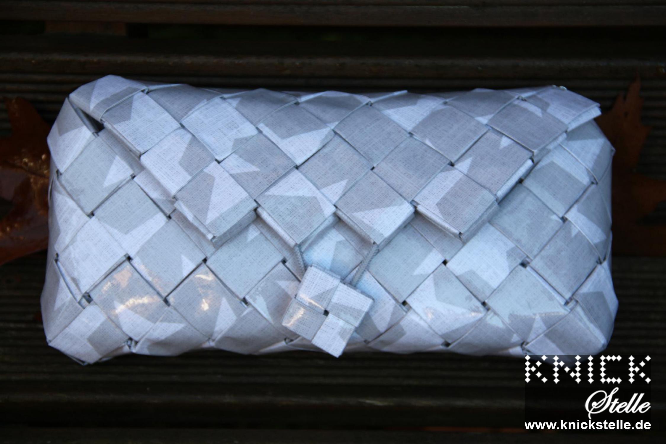 Diese Clutch besticht durch ihr besonderes Papier. Das Papier hat den Druck von einem grauem Stoff mit hellgrauen bis weißen Sternen. Da die Sterne sehr groß waren, sind nun nur noch einige Spitzen von diesen zu erkennen. Die Clutch lässt sich sowohl dezent, als auch als Eyecatcher zu jeglichem Outfit tragen. Eine silberne Trägerkette vollendet diese Clutch.