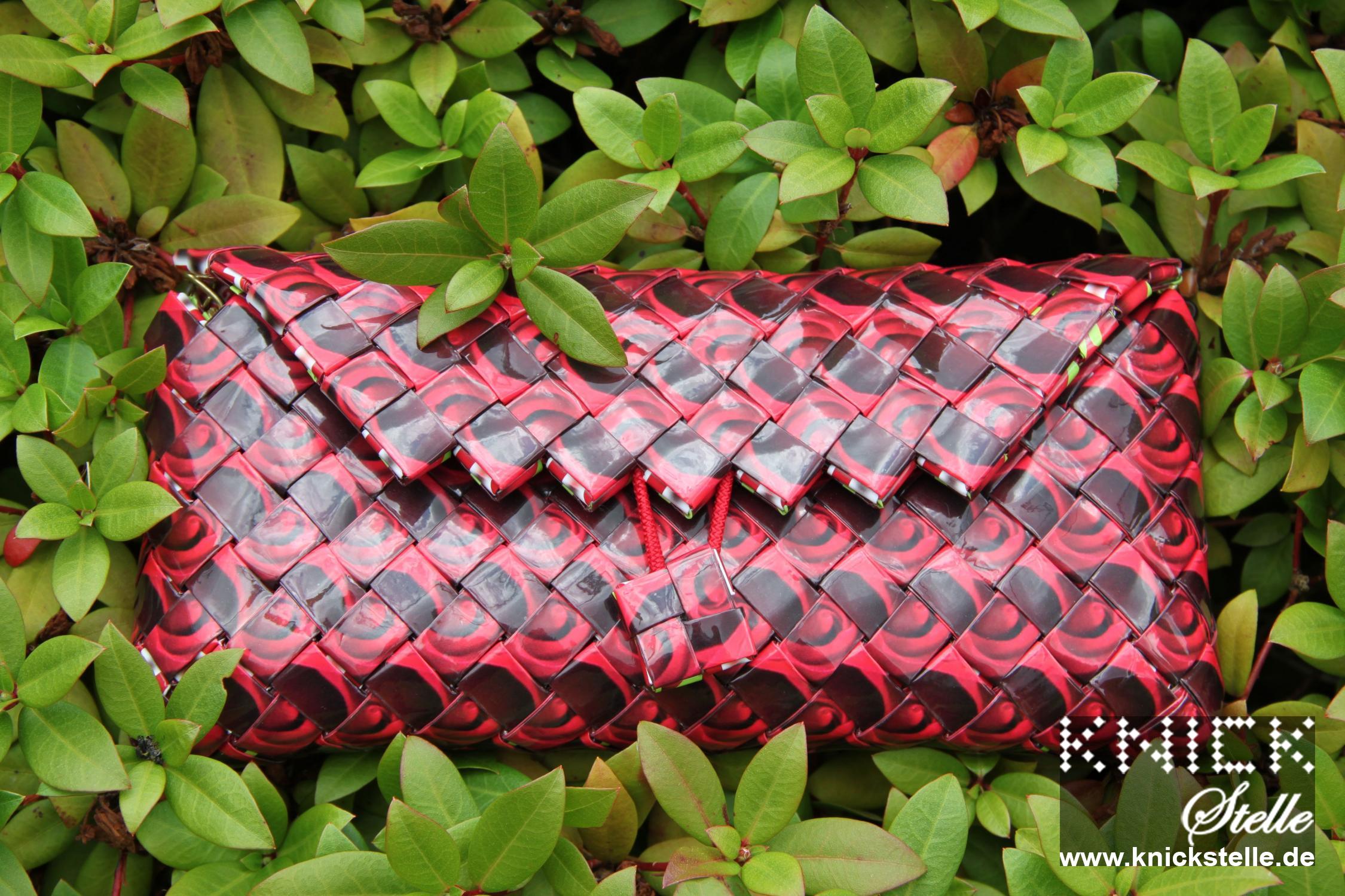 Wie der Name schon verrät wurde hier das Bild einer Rose als Motiv verwendet. Sie ist aus Flyern zum Iserlohner Event "Rosenlust" enstanden. Da mir dieses Motiv so oft zur Verfügung stand konnte ich hier durch die Wiederholung von zwei Ausschnitten ein ganz besonderes Bild erhalten. Sie wirkt sehr ruhig und ist eine ganz klassische rote Clutch. Doch das Öffnen der Clutch bietet eine große Überraschung: Das Innere ziert ein hellgrünes Schnörkelmuster auf rotem Hintergrund. Die warmen Rottöne der Clutch harmonieren mit ihrer goldenen Trägerkette.