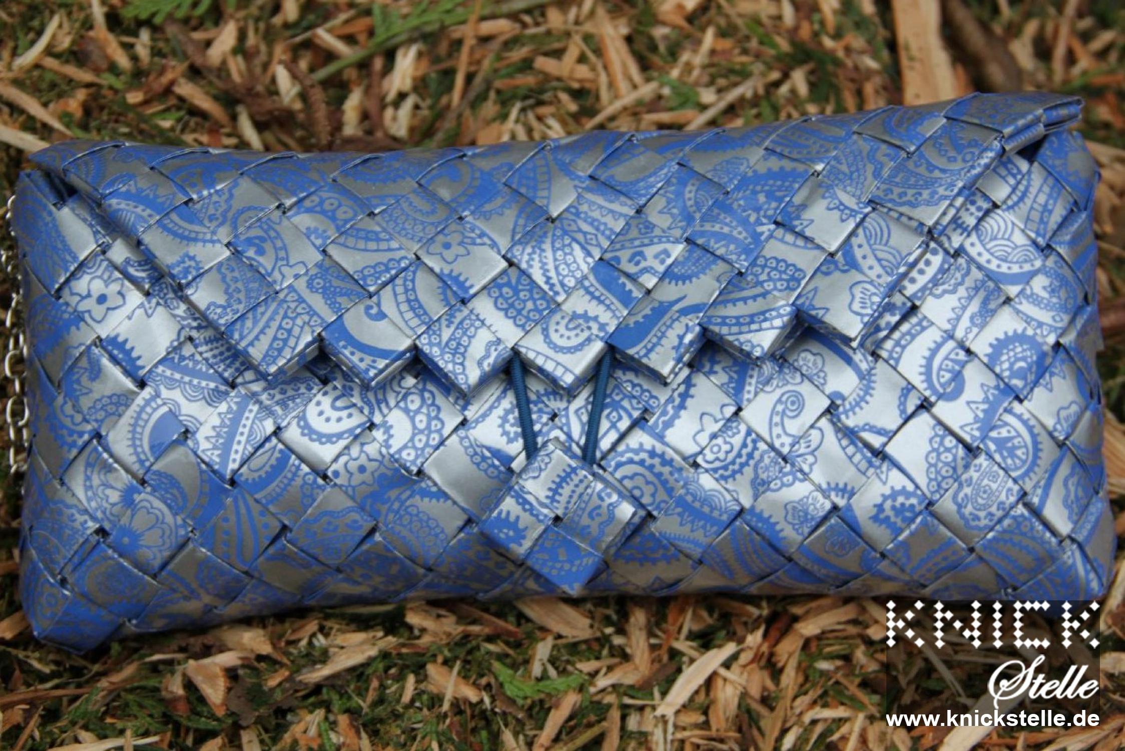 Diese Clutch wurde aus silbernen Papier mit einem blauen Neobarock-Muster gearbeitet. Es sind kleine Ausschnitte des feinen Musters zu sehen, die diese Clutch etwas verspielt wirken lässt. Aber der silberne Hintergrund ermöglicht gleichzeitig eine vornehmere Kombination. Sie hat eine silberne Trägerkette.