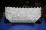 Hier wurde ein Buch mit altdeutscher Schrift zu einer Clutch verarbeitet. Es wurde eine Designvariante mit schwarz abgesetzten Ecken, Deckel und Knopf ausgewählt. Dadurch ist dies eine ganz klassische Clutch, doch durch das außergewöhnliche Material auch eine Alltagstasche.