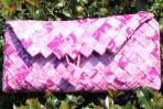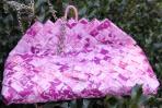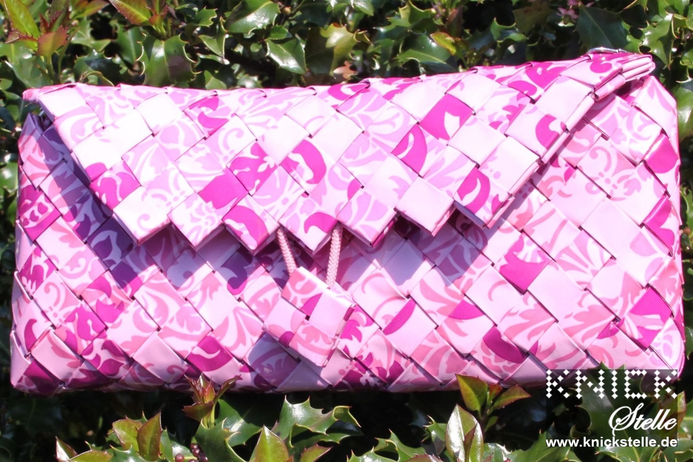 Das Neo-Barock Muster des Papiers kann sowohl verspielt, romantisch als auch schlicht und edel wirken. Durch die Farbgebung kann diese Clutch sowohl zu Rosa, als auch zu Violett kombiniert werden. Diese Eigenschaften macht sie fast schon wandelbar wie ein Chameleon und sie lässt sich somit zu einer Vielzahl von Kleidungsstücken kombinieren. Die Clutch hat einen silbernen Träger, der hervorragend mit der hellen Farbe der Tasche harmoniert.