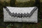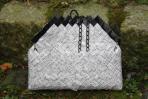 Nach Kundenwunsch wurde hier ein Gesangbuch verarbeitet, bei dem der Deckel mit schwarzem Rand abgesetzt wurde. Passend dazu ist die Clutch mit einer schwarzen Trägerkette versehen.