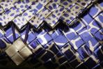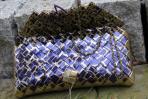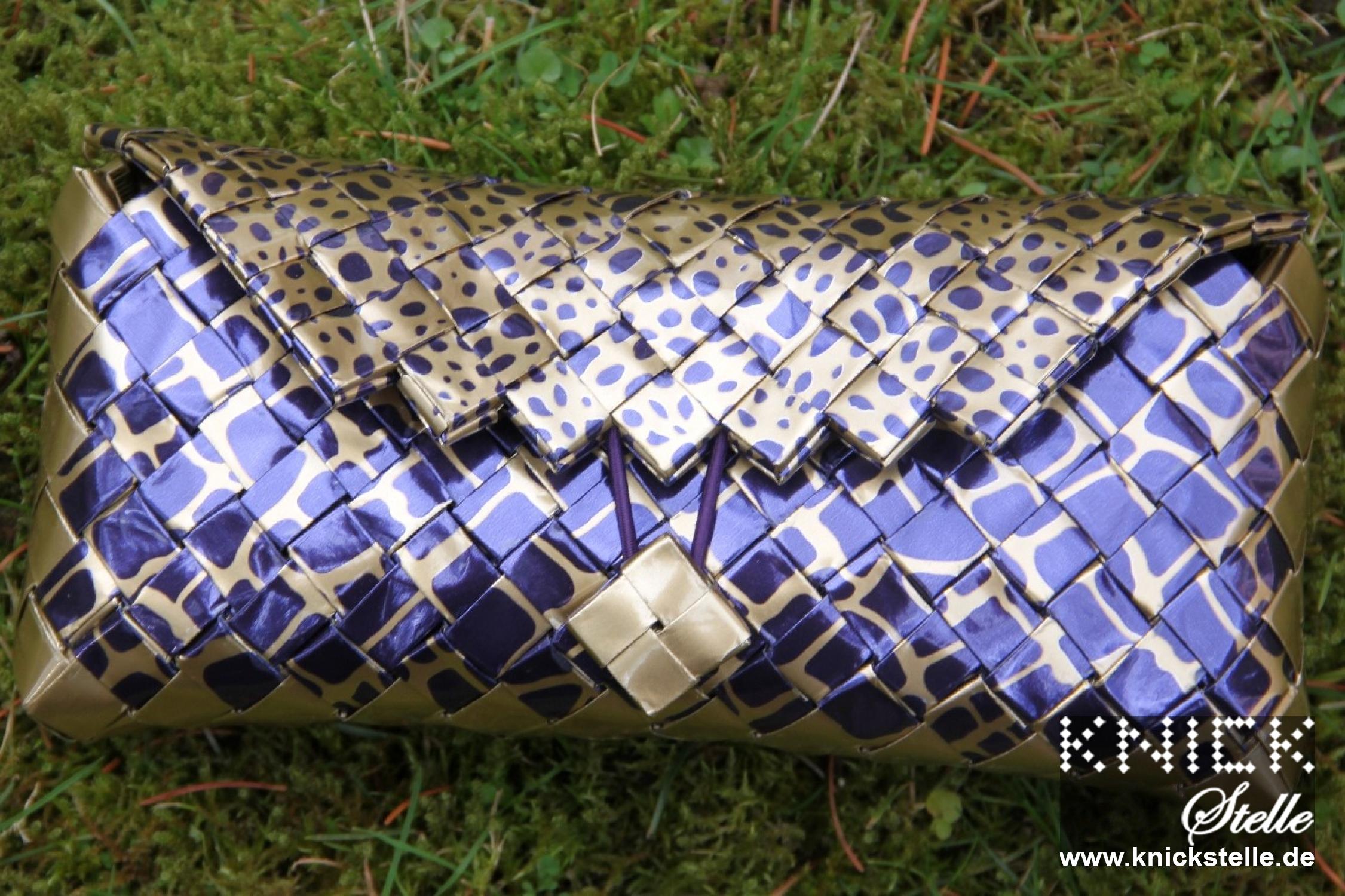 Für diese Clutch wurde Papier mit einem Motiv von Krokodillederoptik verarbeitet. Sie hat einen Rahmen und Knopf aus goldenem Papier. Das Papier des Deckels ist so gefaltet, dass ein feines Motiv der zu sehen ist. Natürlich ist die Clutch mit einem passenden goldenen Träger ausgestattet.