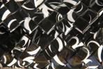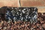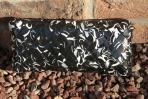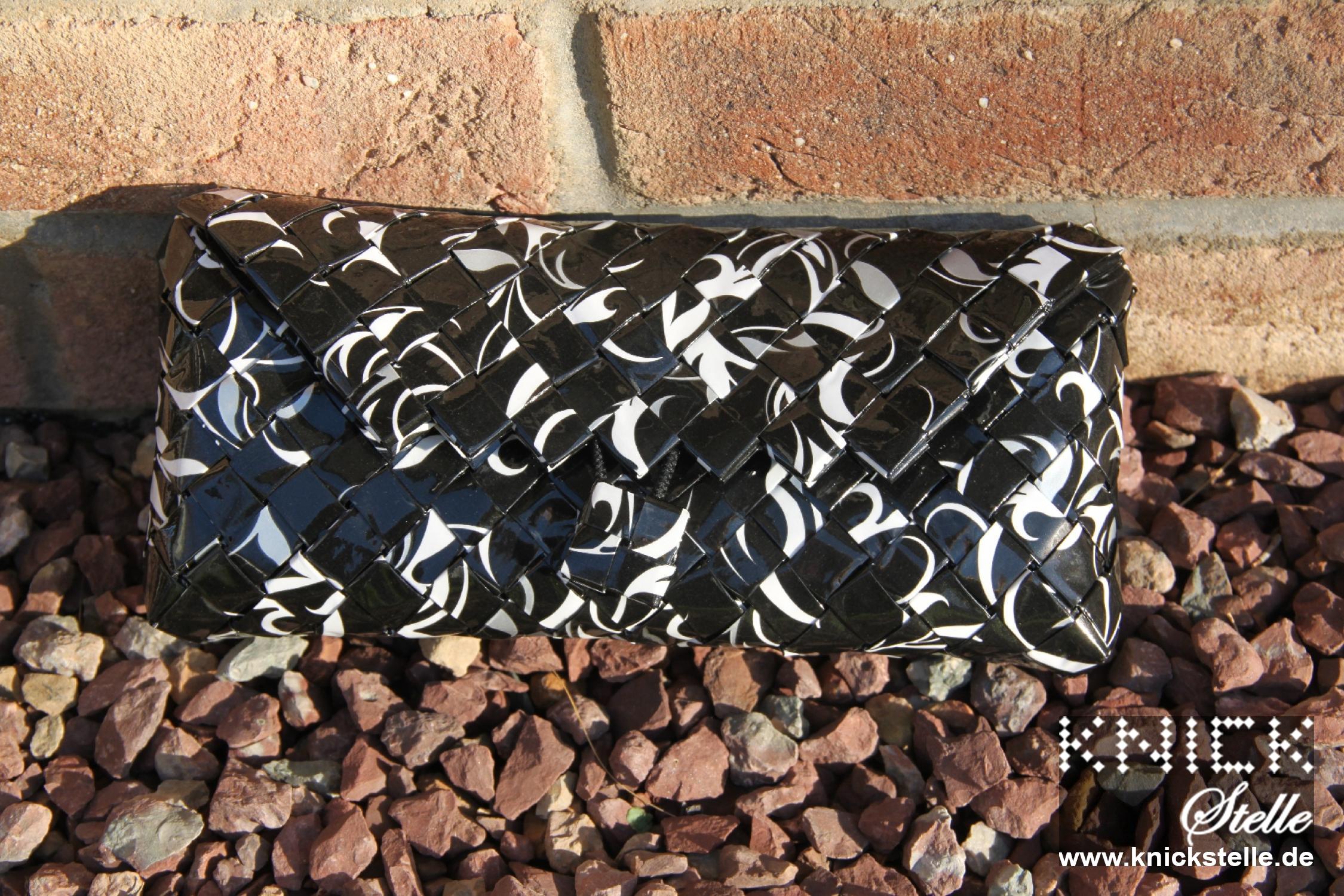 Dies ist eine ganz klassische und elegante Clutch aus schwarzem Papier mit silbernen und weißen Schnörkeln. Die Clutch ist natürlich mit einer schwarzen Trägerkette ausgestattet.
