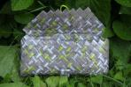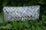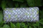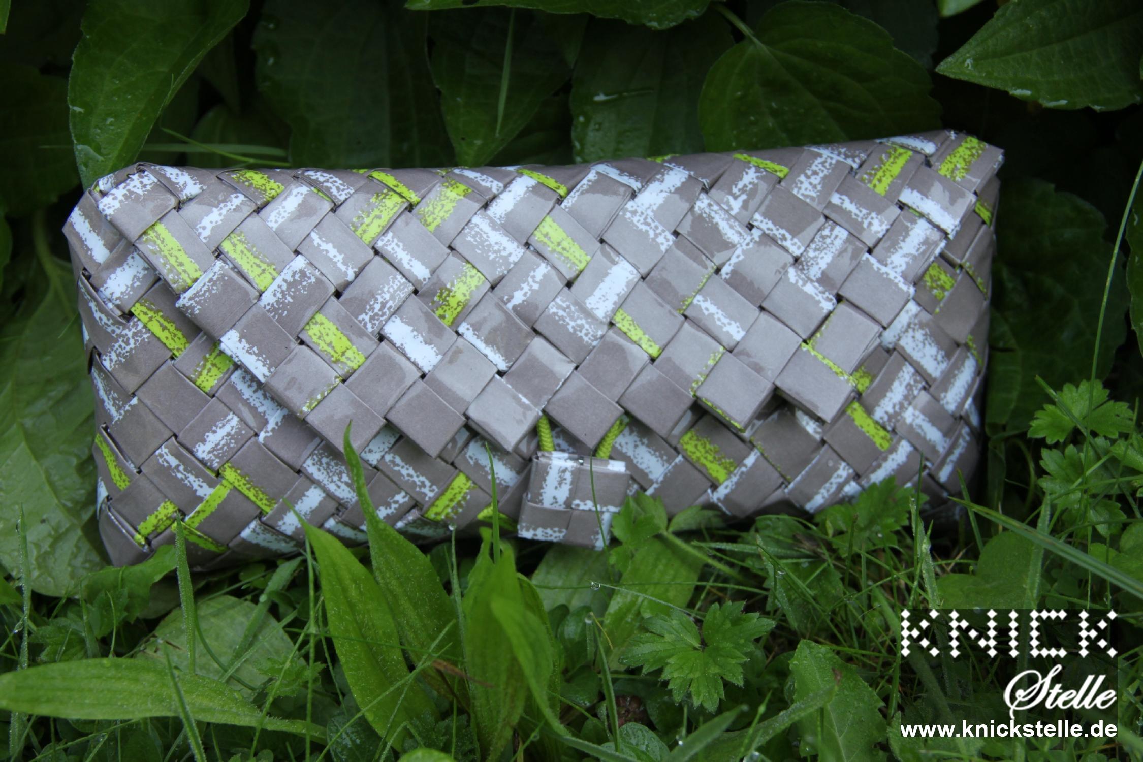 Weiße und grüne Streifen auf grau-braunem Hintergrund zieren diese Clutch. Dadurch ist sie sowohl dezent, als auch als Highlight zu tragen.