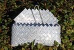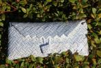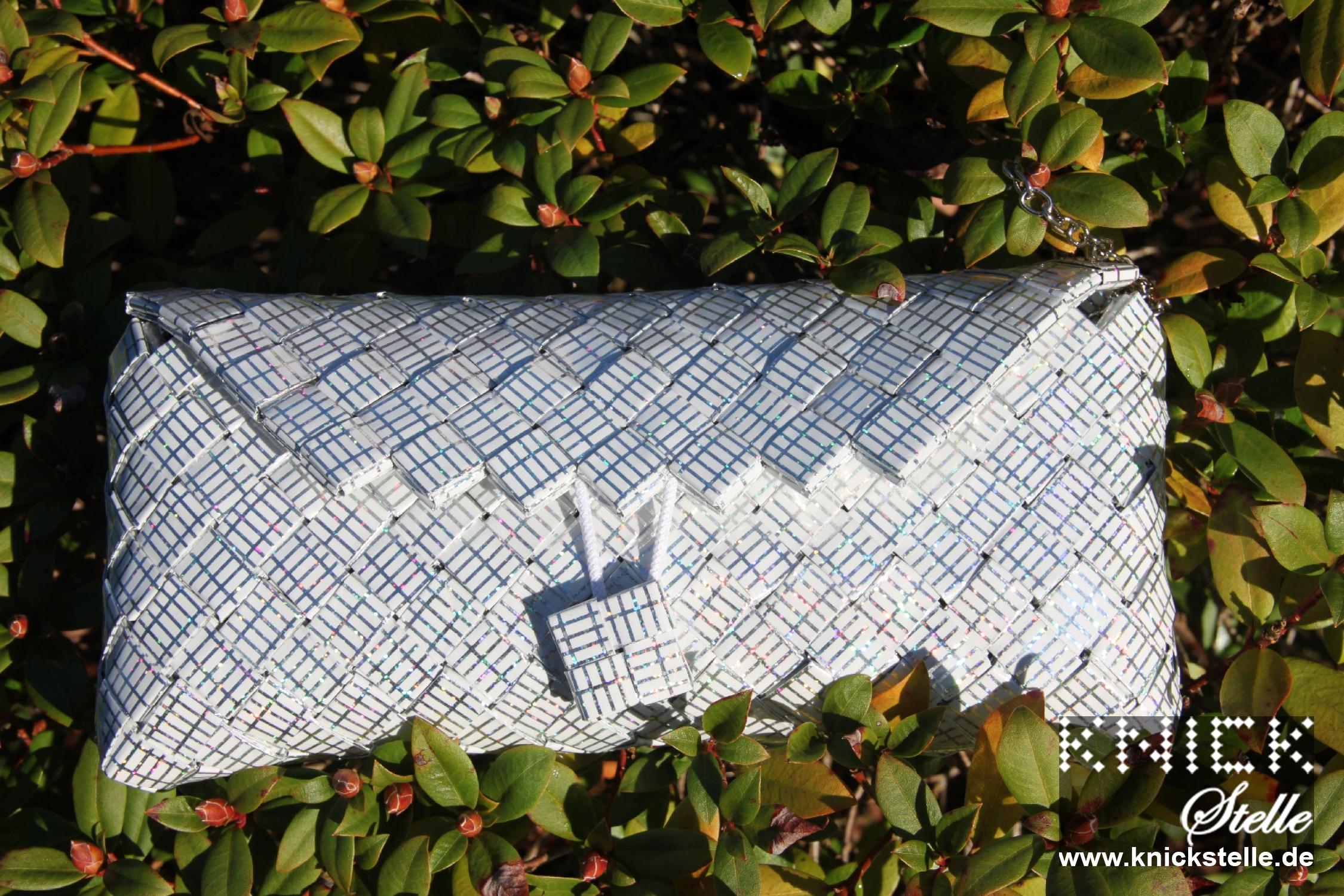 Eine ganz edle Clutch ist hier aus weißem Papier mit einem Gitter aus Silber mit Hologramm-Effekt. Mit der silbernen Trägerkette ist sie die perfekte elegante Begleiterin geworden.