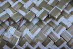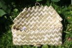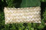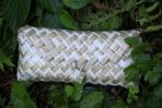 Klassisch und elegant ist diese Clutch aus weiß-gold gestreiftem Papier. Sie hat eine goldene Trägerkette.