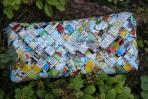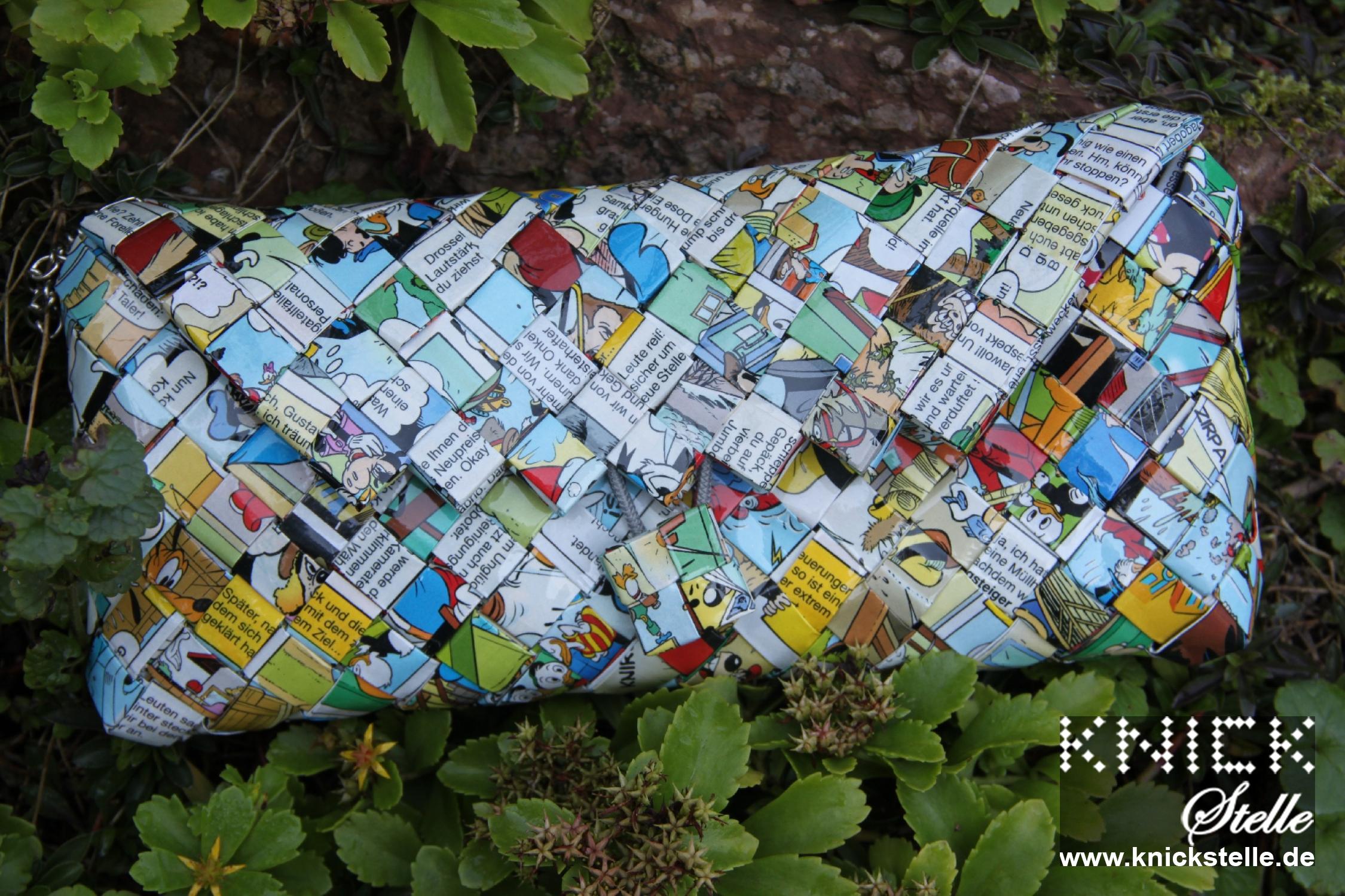 Eine Comictasche aus Donald Duck Comics. Die Clutch hat eine silberne Trägerkette.