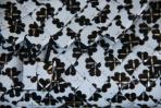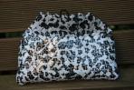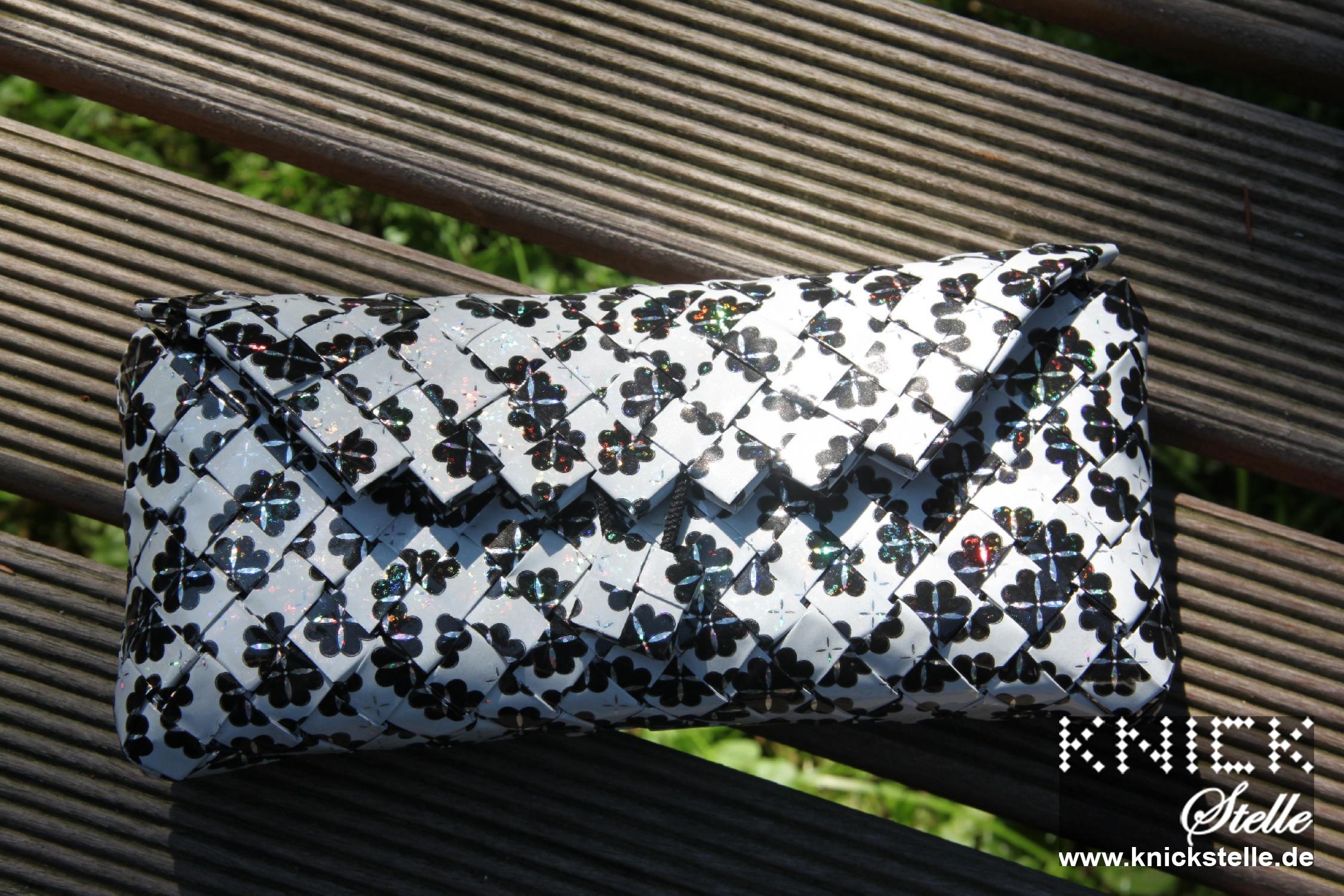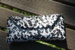 Schwarze Blumen auf silbernem Papier mit Hologramm-Effekt. Durch dieses Motiv ist die Clutch sowohl feminin verspielt, als auch elegant und klassisch. Sie hat eine silberne Trägerkette.
