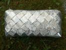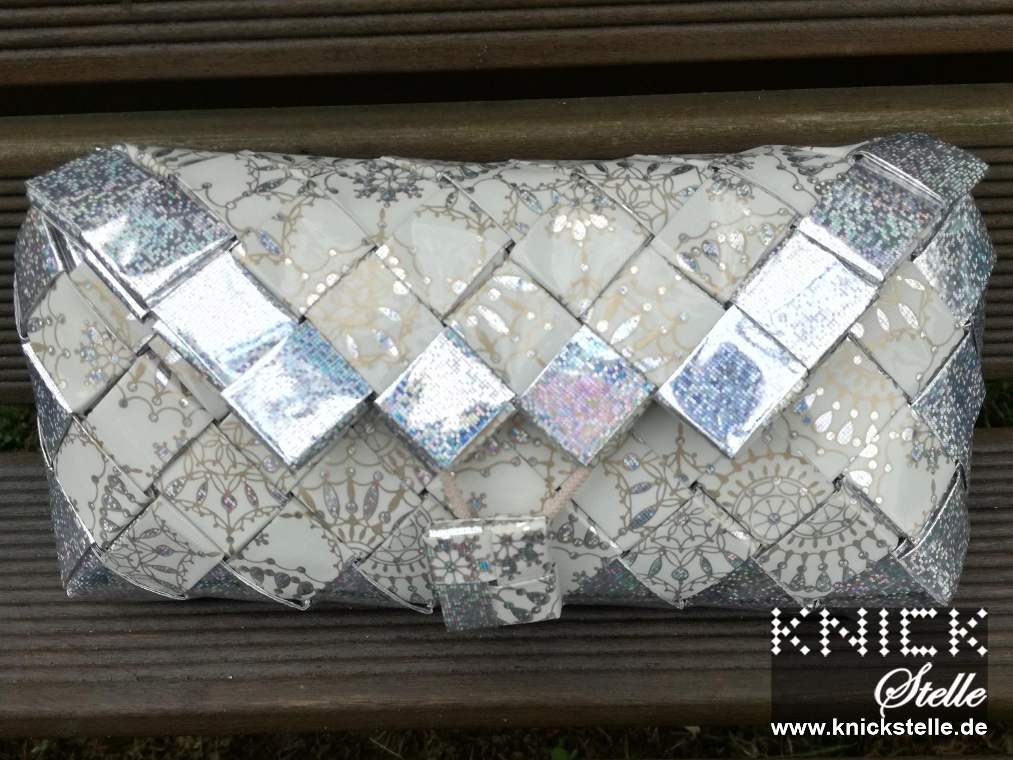 Dies ist eine ganz elegante Clutch, die aber auch bei jeder Party die perfekte Begleiterin ist. Das silberne Hologrammpapier bringt sie bei allen Anlässen zum Funkeln. Sie hat eine silberne Trägerkette.