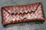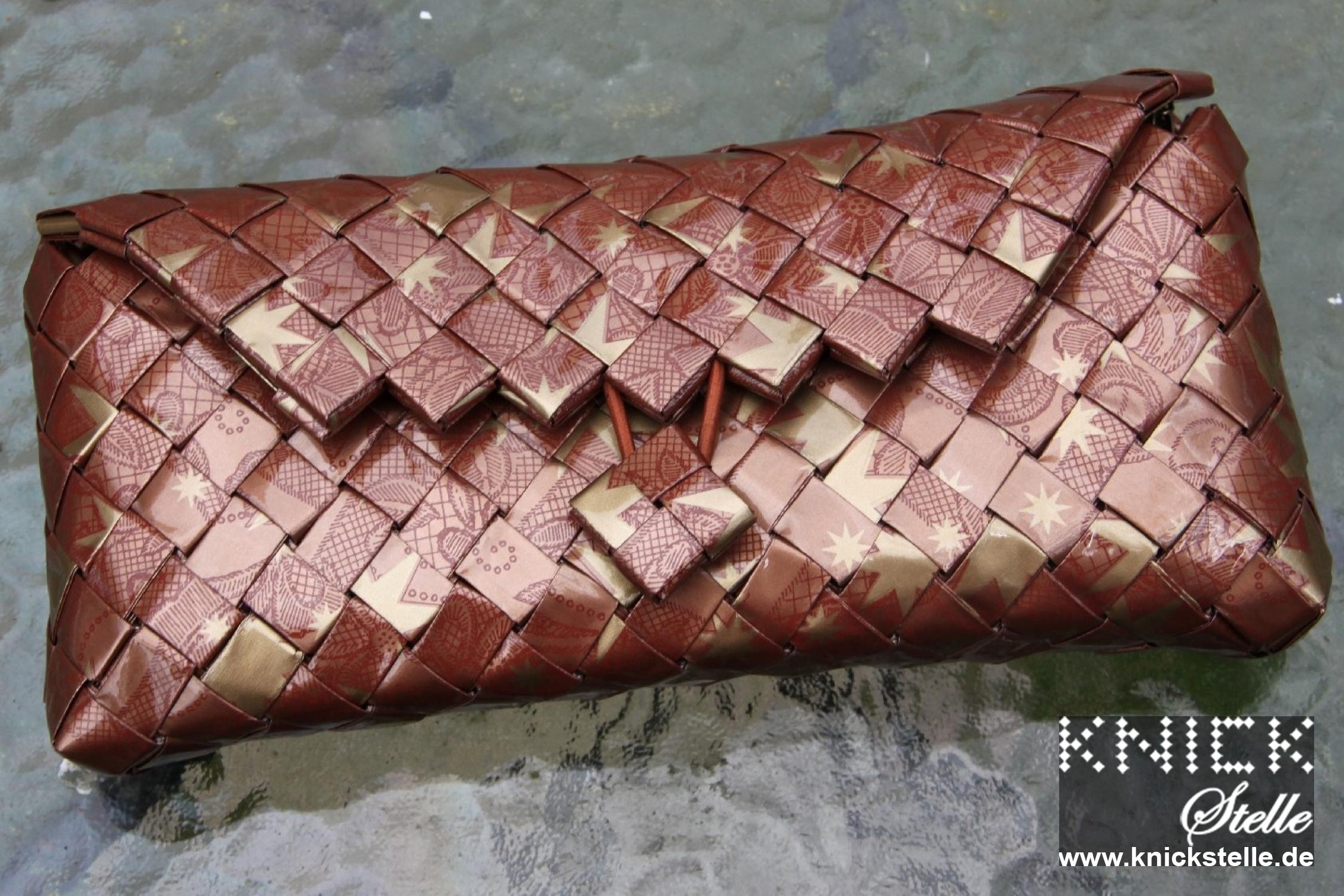 Kupferbraunes Papier mit goldenen Sternen und dunkelbraunen Mustern ziert diese Clutch.