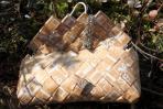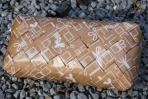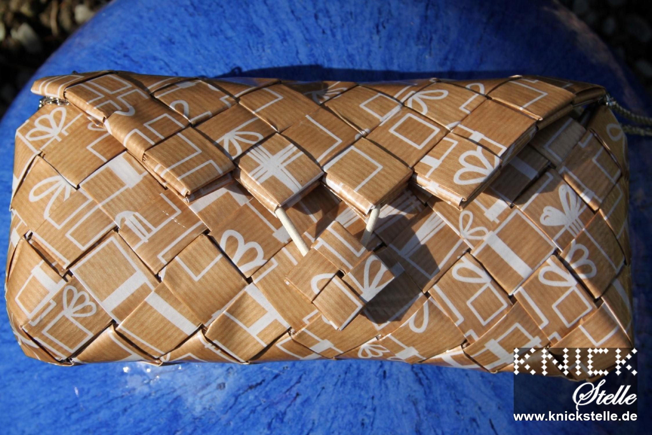 Braunes Packpapier mit einem weißen Druck von Geschenken, macht diese Clutch zu einer optisch sehr ruhigen und daher auch sehr kombinationsreichen Begleiterin.