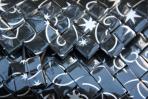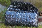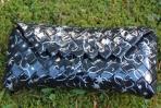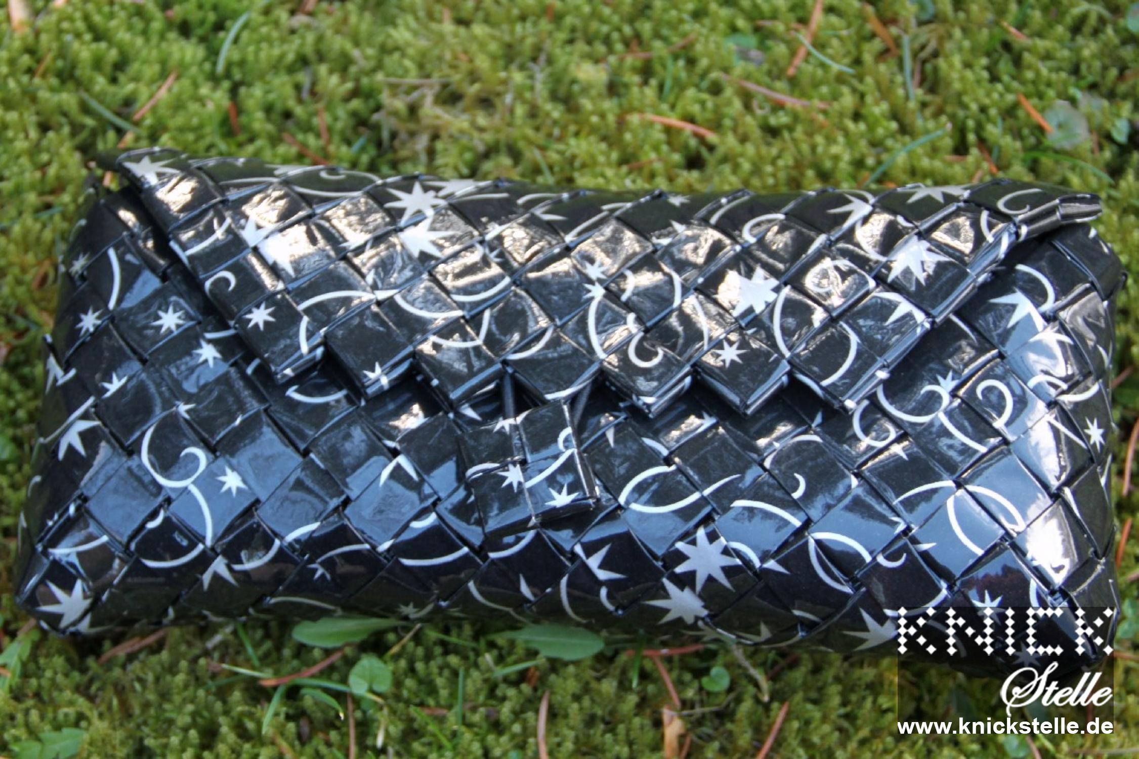 In klassischem Schwarz erstrahlt diese Clutch ergänzt durch silberne Schnörkel und Sterne.