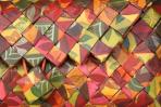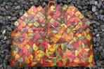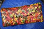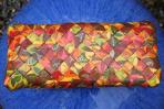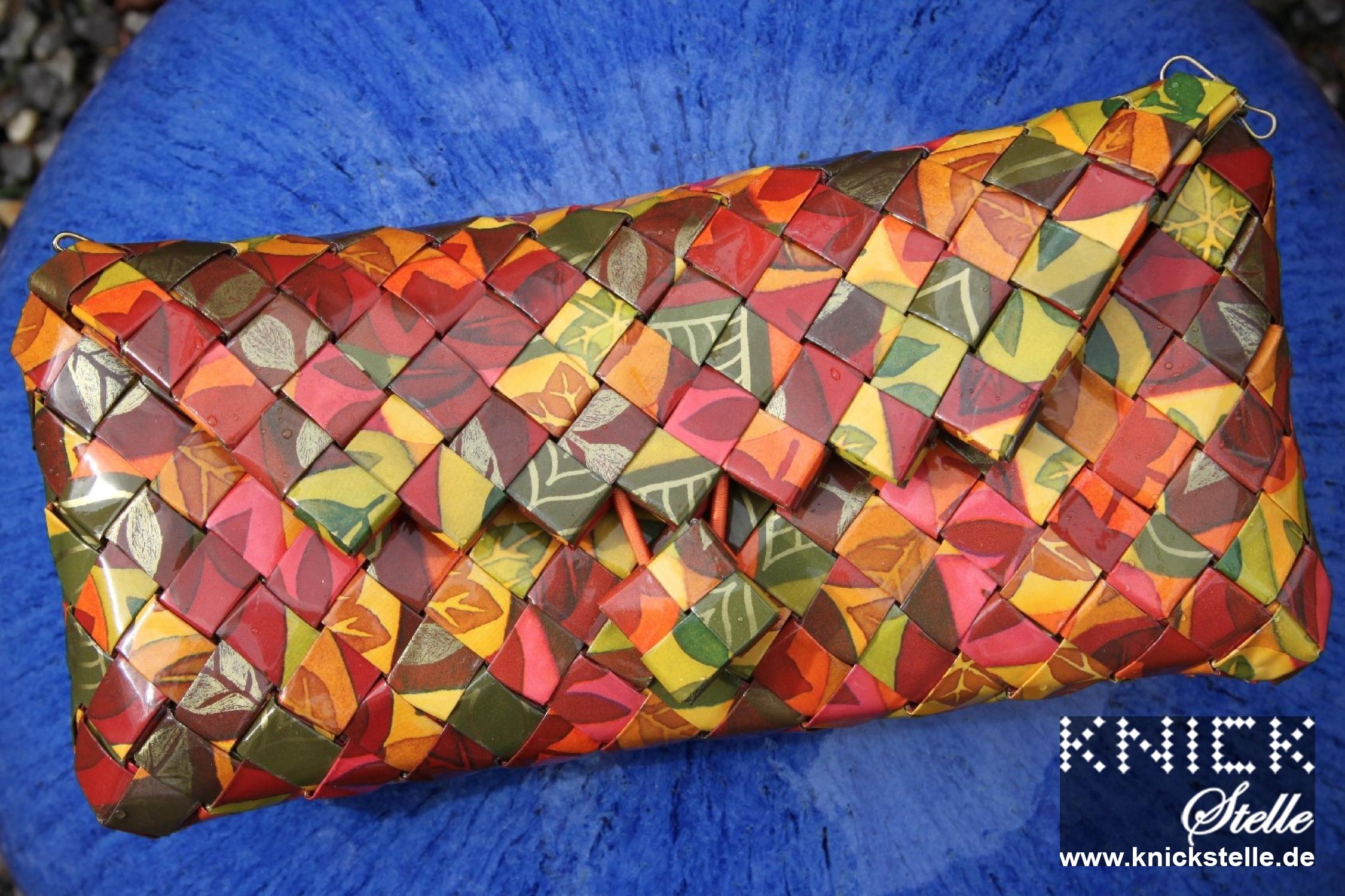 Sehr herbstliche Farben harmonisieren in dieser Clutch. Sie hat eine braune Trägerkette.