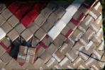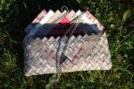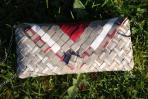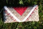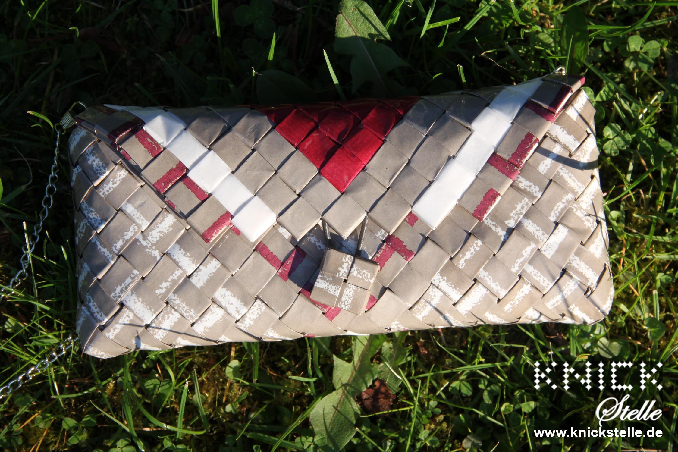 Für diese Clutch wurden verschiedene Papiere mit einem braun-grauen Hintergrund und farbigen Streifen kombiniert. Da es nicht genug Papier für eine komplette Clutch gab, wurde unifarbiges Papier in einem besonderen Rautenmuster zu einer einzigartigen Clutch kombiniert.