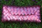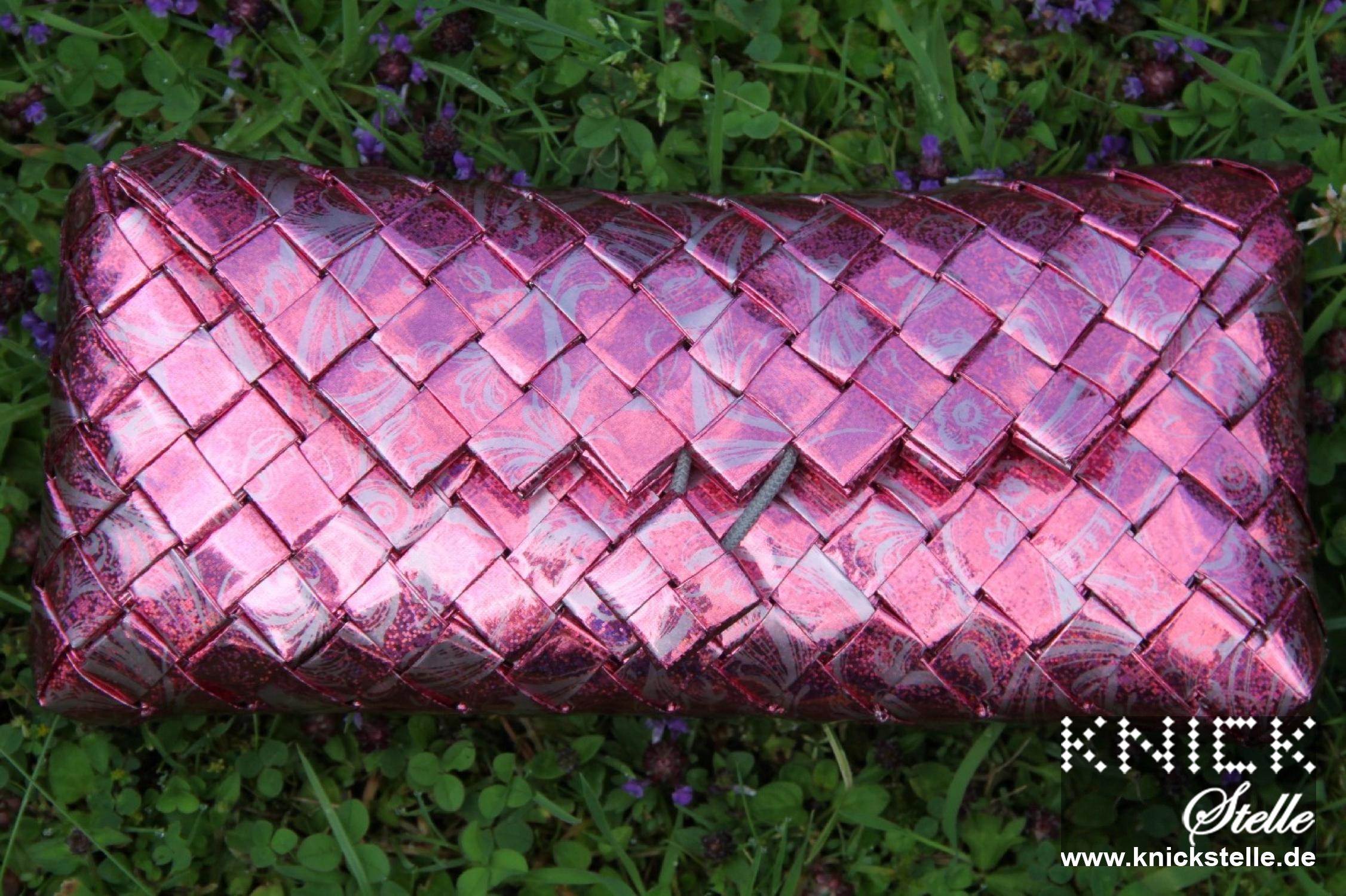 Sowohl mädchenhaft, als auch Lady-like gibt sich diese Clutch durch das außergewöhnliche Papier. Sie ist aus einem rosa/ pinken Papier gefertigt, dass einen Hologramm-Effekt hat. Zudem befindet sich ein silber-graues Rankenmotiv auf dem Papier. Diese Clutch glitzert bei jeder Bewegung und ist ein absoluter Eyecatcher. Passend zu dem Hologramm-Effekt hat die Clutch eine silberne Trägerkette.