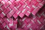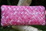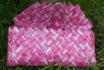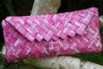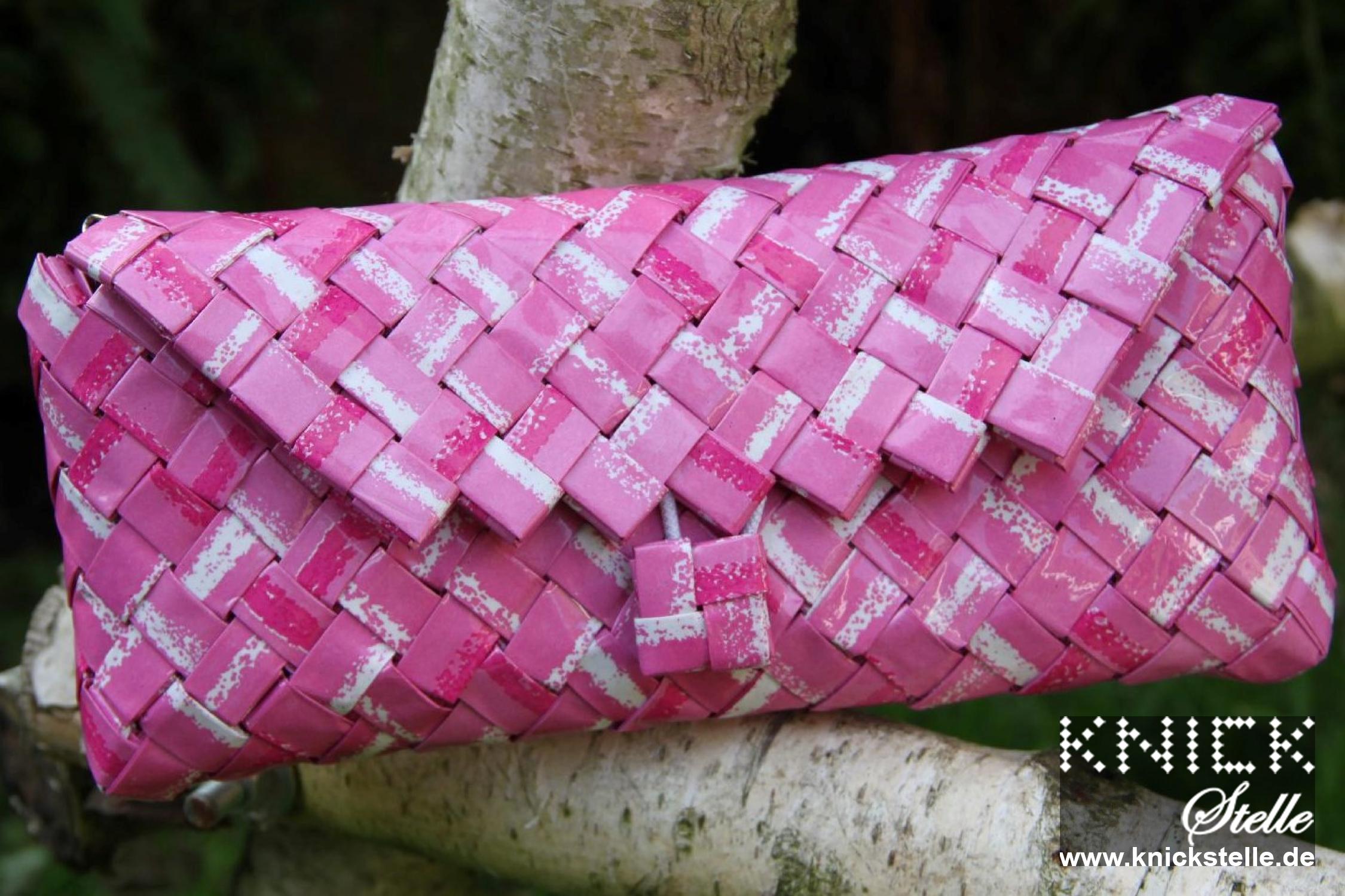 Eine ganz feminine Begleiterin ist mit der Clutch "Unstrut" entstanden. Das besondere Muster entsteht durch die Verwendung von einem rosafarbenen Papier mit weißen und dunkelrosafarbenen Streifen. Da der Druck dieser Streifen leicht gebrochen ist, wirkt die Tasche sehr sanft und etwas verspielt. Passend zum hohen weiß-Anteil der Clutch hat sie eine silberne Trägerkette.