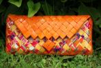 Diese Cluch erstrahlt in einem leuchtenden Orange. Ein Muster mit bunten Schmetterlingen auf gestreiftem Hintergrund ziert hier das Zentrum der Clutch. Die Einrahmung durch orangene Seiten, Boden, Deckel und Knopf verleiht dieser Clutch einen edlen Charakter. Das Orange harmoniert schön mit der goldenen Trägerkette dieser Clutch.