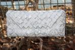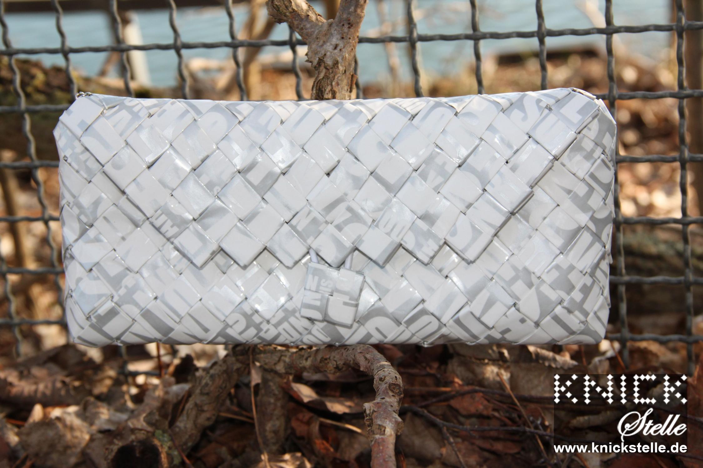 Weiße Schrift auf silbernem Hintergrund ist bei dieser Clutch als Motiv genutzt worden.Die einzelnen Buchstaben sind entweder teilweise oder ganz zu erkennen. Dies lädt den Betrachter zu einem Spiel mit den Buchstaben ein. Da der Hintergrund ebenfalls sehr hell ist, ist die Wirkung der Clutch sehr edel und keinesfalls kindlich. Als Eyecatcher wird sie sowohl auf heller, als auch auf dunkler Kleidung einen großen Effekt erzielen. Da die Clutch überwiegend silber ist hat sie natürlich auch eine silberne Trägerkette.
