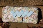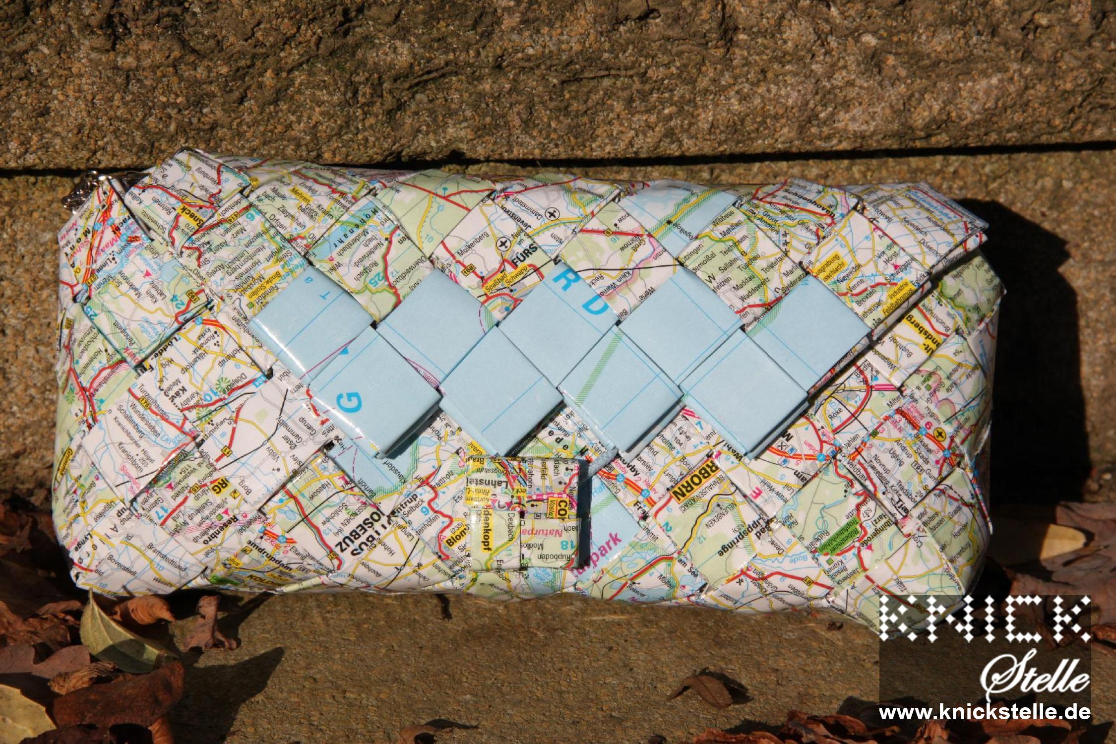 Für diese Clutch wurde ein Straßenatlas verarbeitet. Wer genau hinsieht erkennt vorne Paderborn, hinten Rügen, an der Seite Berlin und noch viel mehr. Bei dieser Clutch ist sofort zusehen, dass es sich um ein ungewöhnliches Material für eine Clutch handelt. Daher ist sie auf jeden Fall immer ein Gesprächsanlass. Passend zum blauen Deckelabschluss hat die Clutch eine silberne Trägerkette