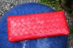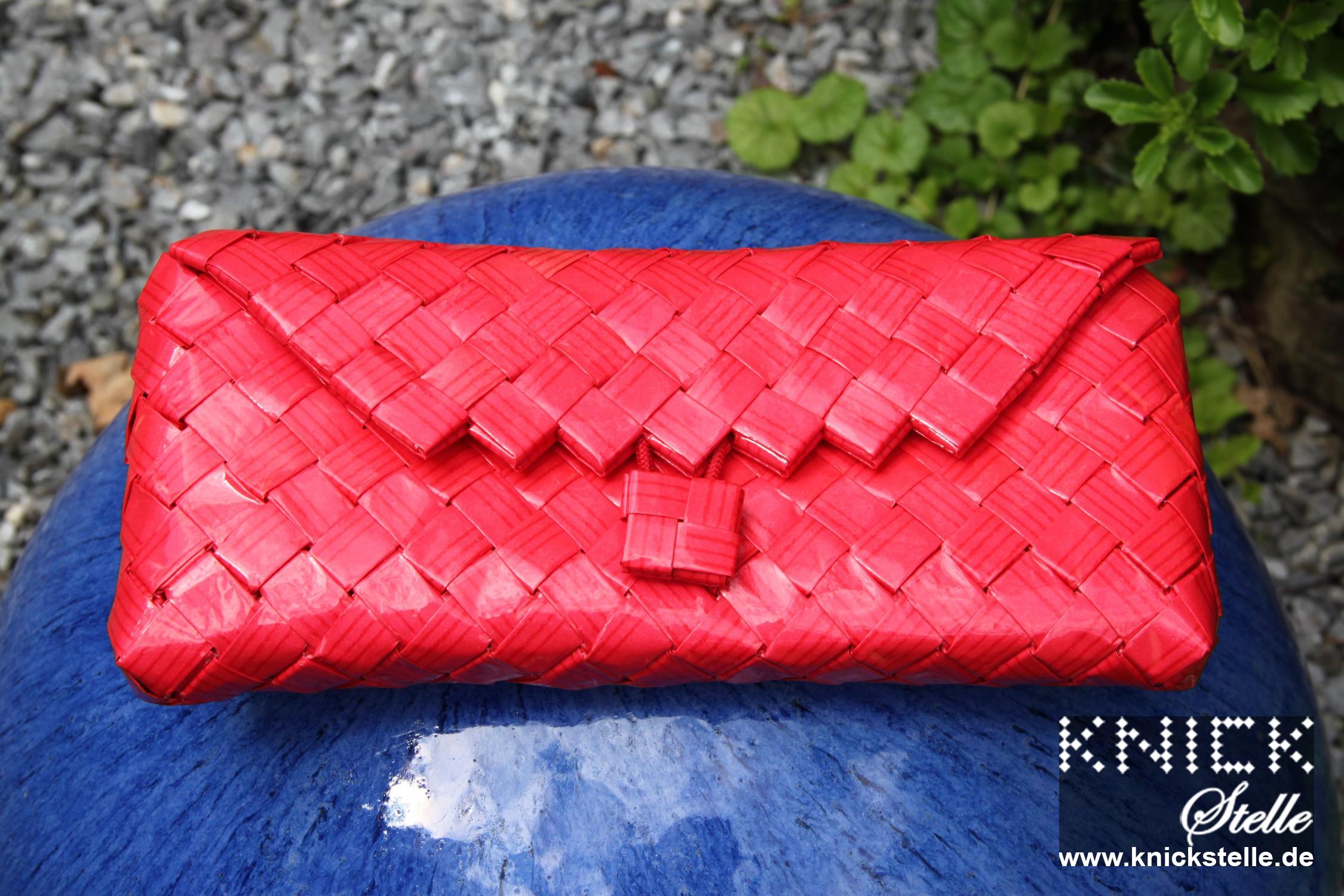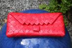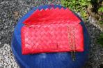 Diese Clutch bestricht durch ihre Schlichtheit. Roter Hintergrund mit feinen dunkelroten Streifen. Trotz ihres schlichten Musters ist sie durch ihre Farbe ein Eyecatcher. Sie lässt sich dadurch sehr schön kombinieren: Mal als eine dezente und mal als eine sehr auffallende Clutch. Zu dem Rotton dieser Clutch harmoniert die goldene Trägerkette.