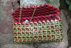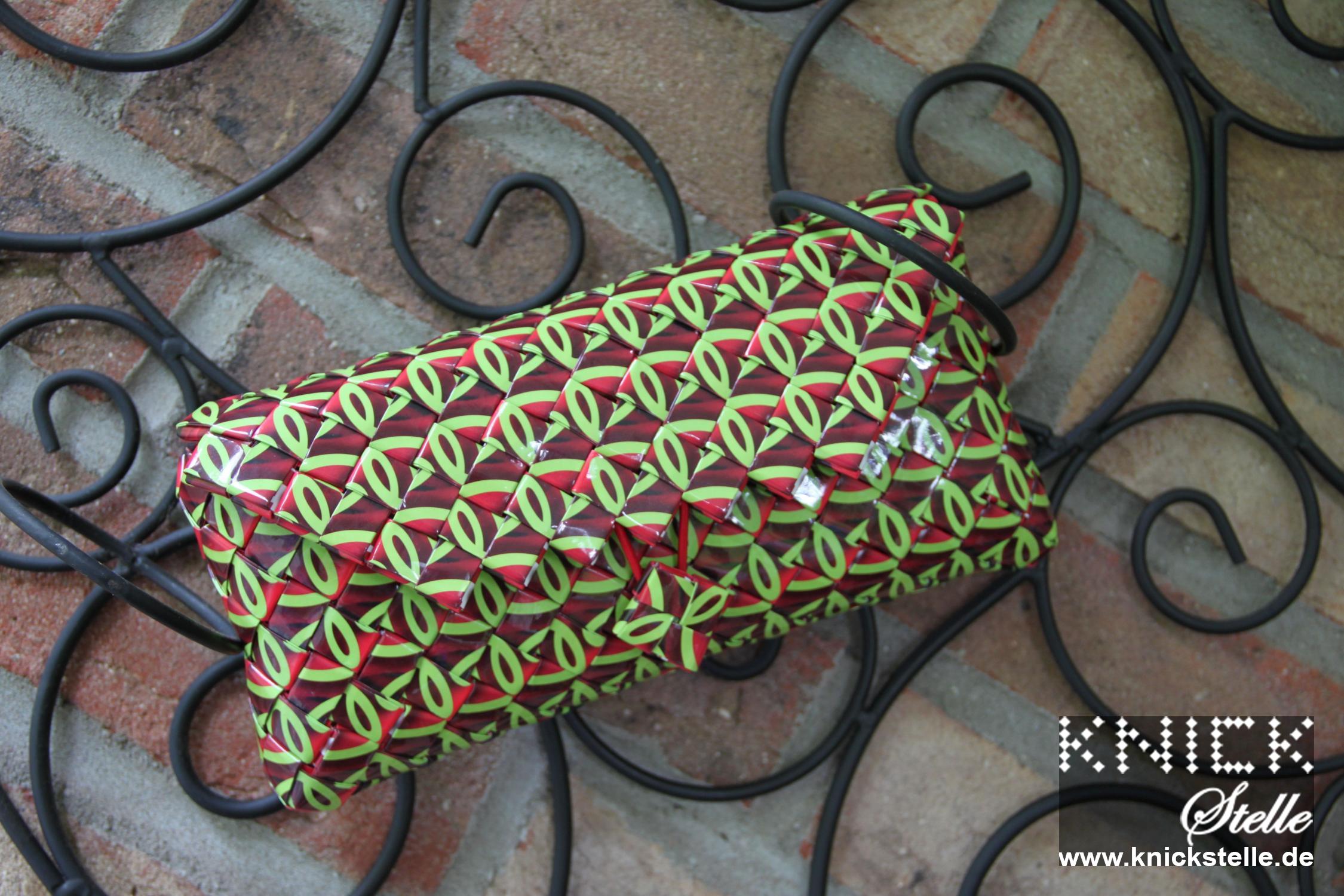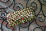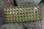 Diese Clutch ist aus Flyern zum Iserlohner Event "Rosenlust" enstanden. Da mir dieses Motiv so oft zur Verfügung stand konnte ich hier durch die Wiederholung von zwei Ausschnitten ein ganz besonderes Bild erhalten: Der Bogen vom "R" und das "e" kann man noch erkennen. Sie wirkt sehr ruhig und hat ein klassisches Schnörkelmuster. Das Innere ziert Ausschnitte von Rosen. Die warmen Rottöne der Clutch gemeinsam mit dem grünen Schnörkeln harmonieren mit ihrer goldenen Trägerkette.