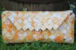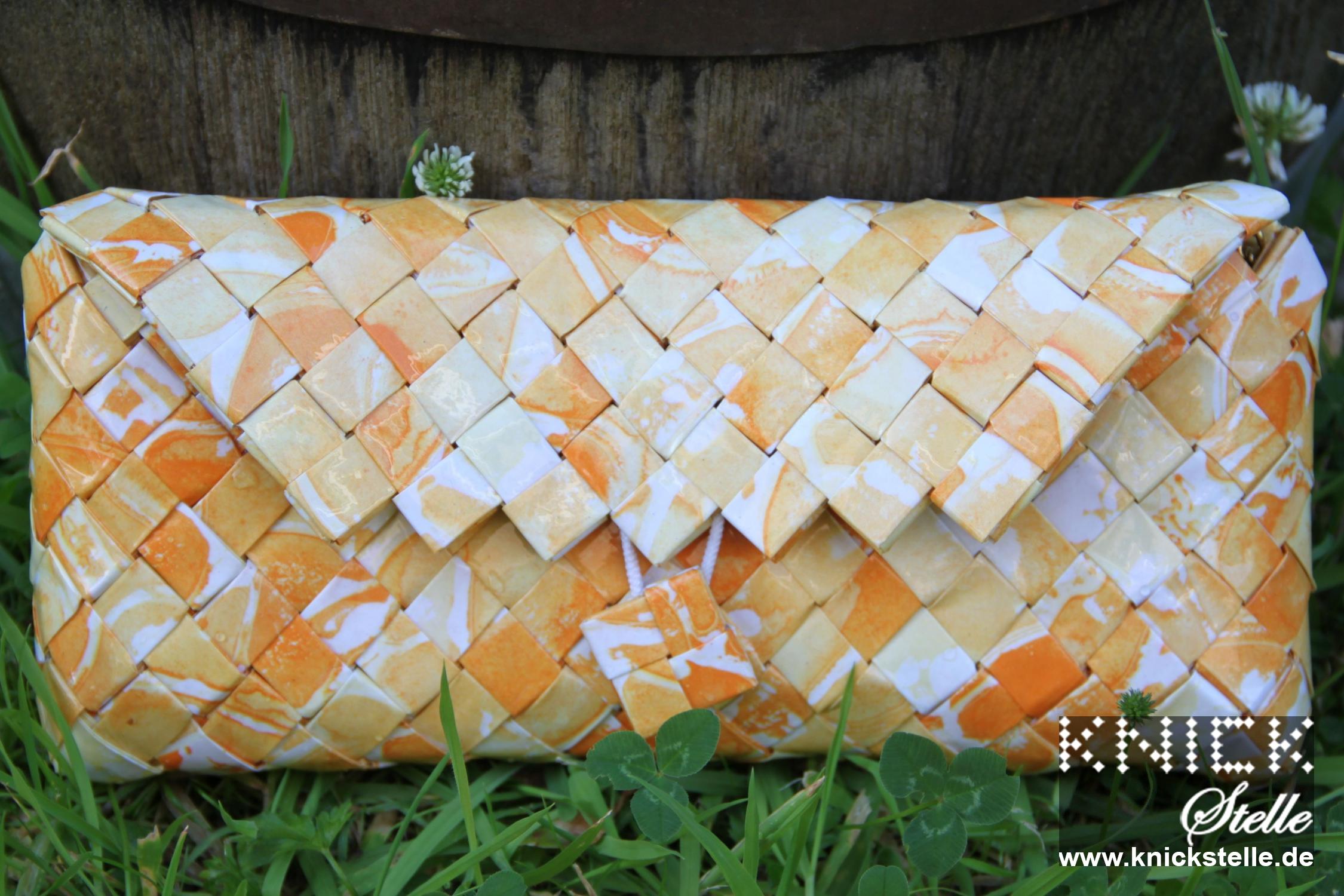 Das gelb-orange marmorierte Motiv des Papiers von dieser Clutch ergibt ein sehr schönes Muster und verleiht der Clutch ihren sommerlichen Charakter. Dadurch ist sie die ideale Begleiterin eines fröhlichen Sommerkleides. Zu dieser Farbkombination passt eine goldene Trägerkette.
