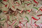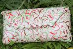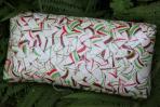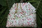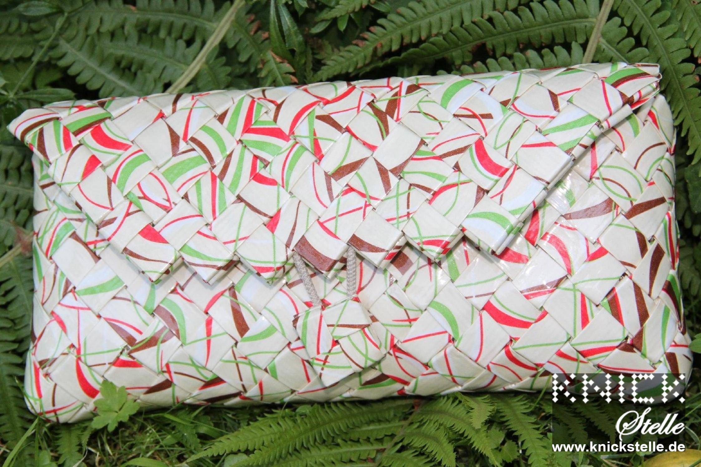 Hier ist eine sehr helle Clutch aus beigen Papier mit roten, grünen und braunen Wellenlinien entstanden. Durch diese Farbkombination ist sie zu diesen Farben sehr gut kombinierbar und fällt durch ihren hellen Charakter auf jedem dunklen Outfit sofort auf. Trotzdem ist sie durch die einheitliche Verwendung des Papiers auch eine dezente Clutch, die mit einem silbernen Kettenträger vollendet ist.
