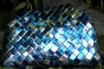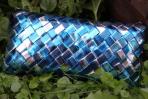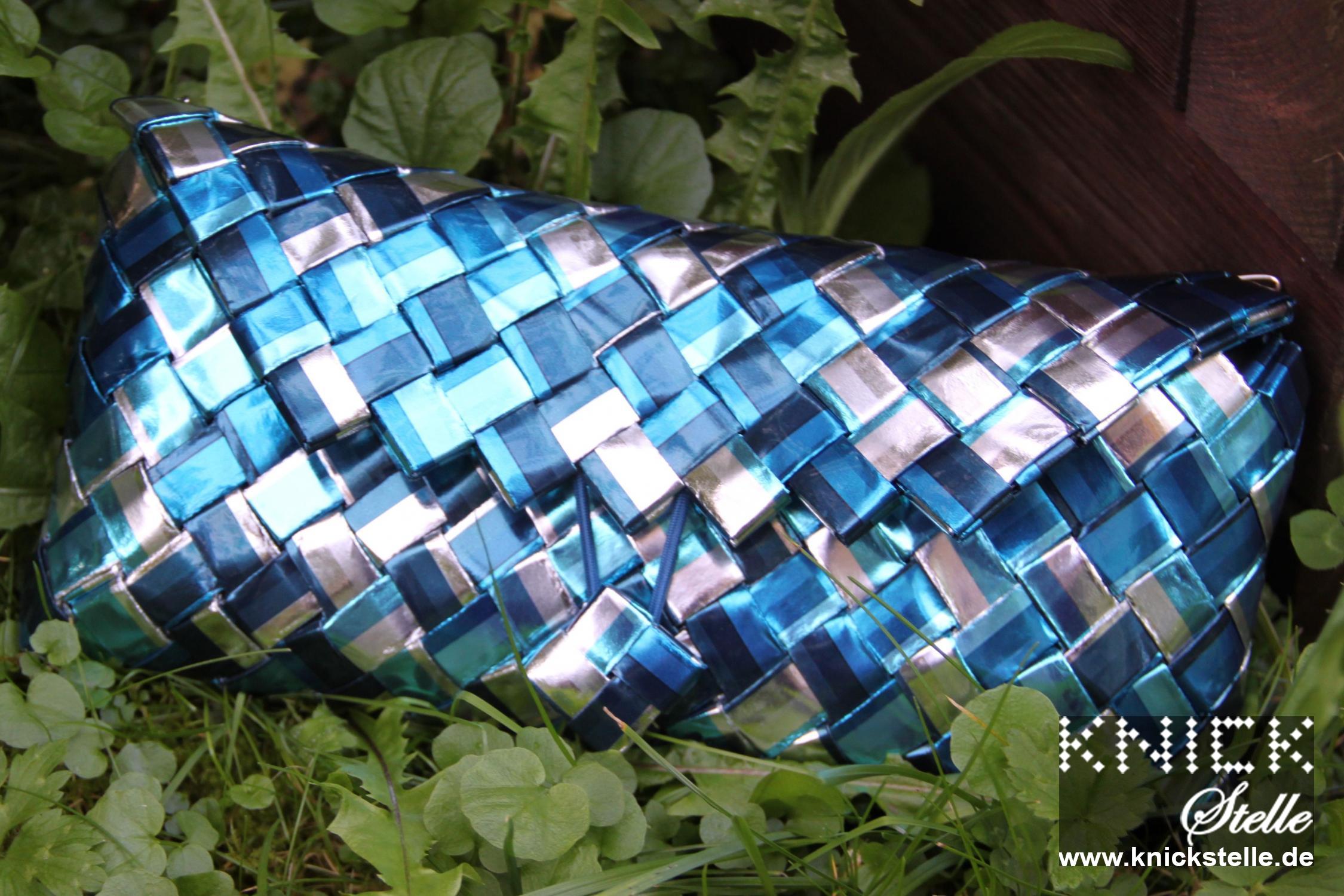 Diese Clutch ist aus metallisiertem Papier mit Streifen in verschiedenen Silber- und Blautönen. Dadurch glänzt diese Clutch sehr intensiv. Durch die verschiedenen Blautöne kann sie sehr gut zu den verschiedensten Blautönen kombiniert werden. Der Silberanteil macht diese Clutch auch bei eleganten Anlässen zur perfekten Begleiterin. Passend dazu hat diese Clutch eine silberne Trägerkette.