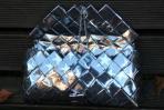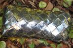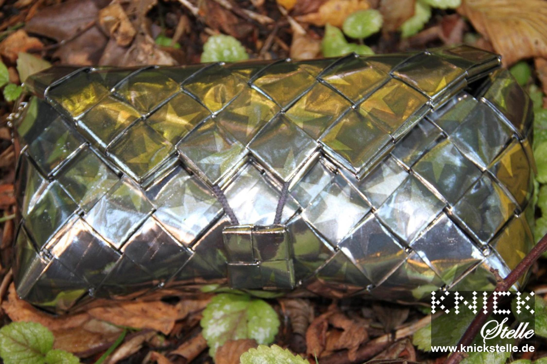 Für diese Clutch wurde Papier mit Metalliceffekt ausgewählt. Dadurch glänzt sie viel stärker, als Clutches aus gewöhnlichem Papier. Auf dem grauen Hintergrund sind silberne Sterne abgebildet. Der Kontrast ist so gering, dass das Motiv ganz dezent ist und erst von der Nähe aus zu erkennen ist. Ausschnitte der Sterne sind ganz dezent zu sehen. Die Trägerkette ist silber.