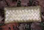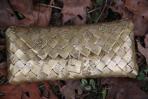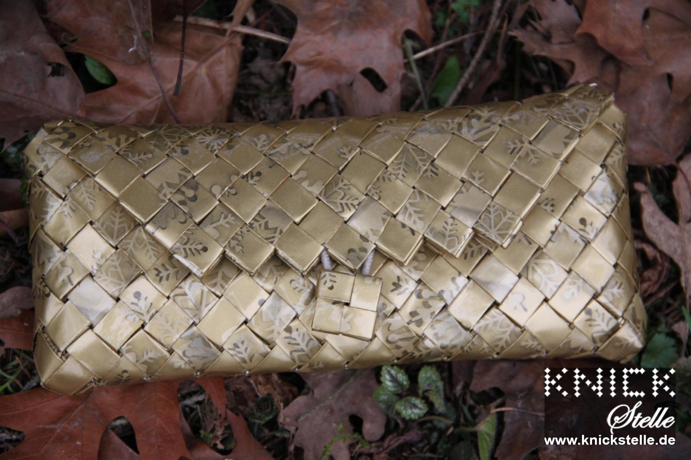 Goldenes Papier mit goldenen Schneeflocken wurde für diese Clutch verwendet. Das Gold ist dezent und lässt sich daher auch leger kombinieren. Die Clutch besitzt eine goldene Trägerkette.