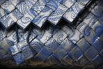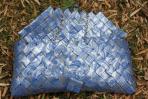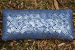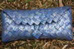 Diese Clutch wurde aus silbernen Papier mit einem blauen Neobarock-Muster gearbeitet. Es sind kleine Ausschnitte des feinen Musters zu sehen, die diese Clutch etwas verspielt wirken lässt. Aber der silberne Hintergrund ermöglicht gleichzeitig eine vornehmere Kombination. Sie hat eine silberne Trägerkette.
