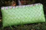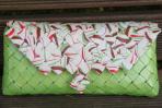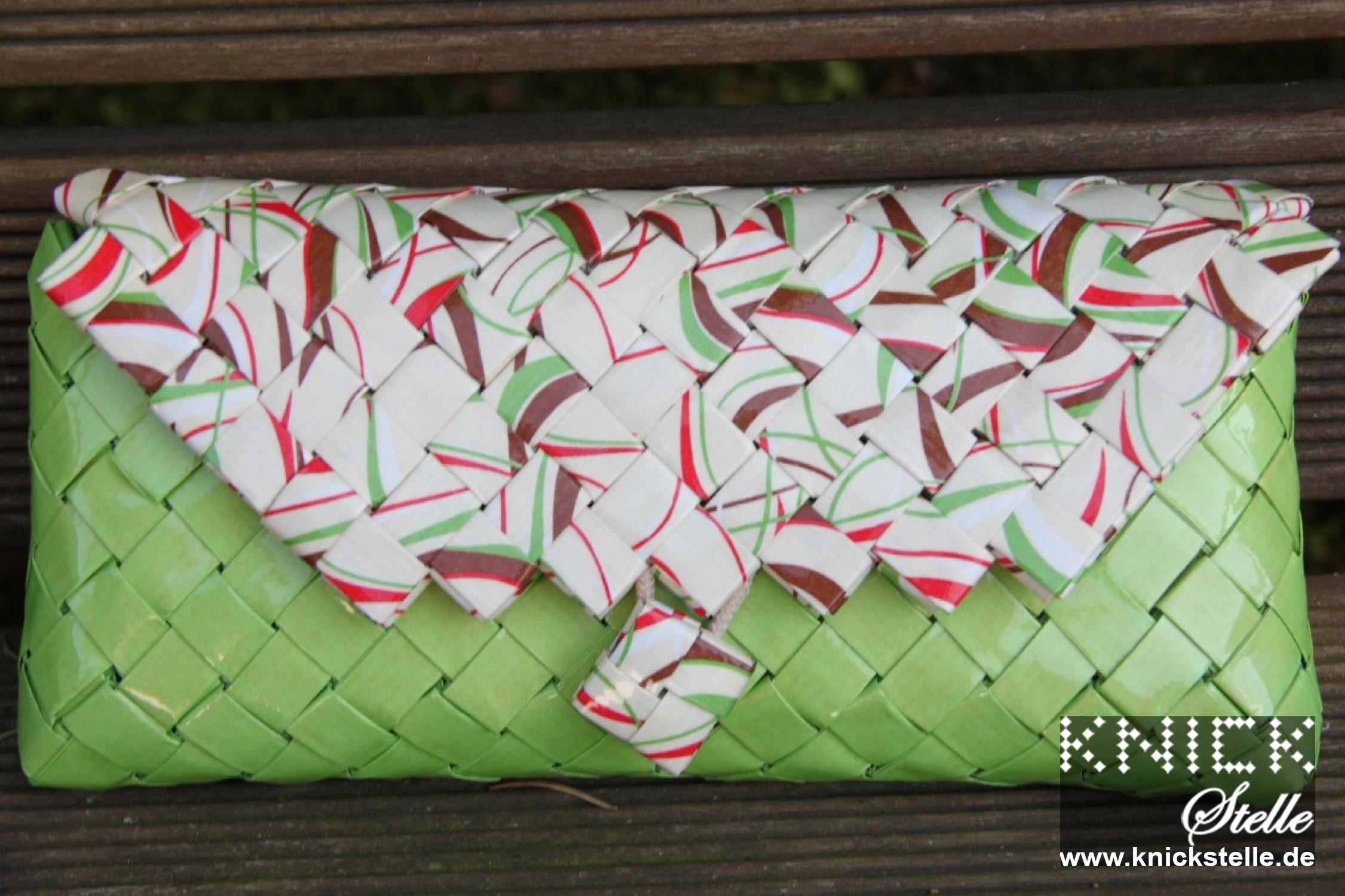 Eine ganz frische Clutch ist die Clutch "Inn" durch den besonderen Grünton. Dieser ist bei dem Körper der Clutch verwendet worden. Der Deckel und der Knopf sind passend dazu mit einem beigen Papier gearbeitet. Auf diesem Papier sind Wellen in Rot, Dunkelbraun und genau dem gleichem Grünton, wie bei dem Rest der Clutch. Passend zu der frischen und hellen Farbgebung der Clutch hat sie eine silberne Trägerkette.