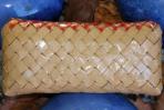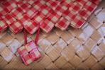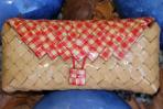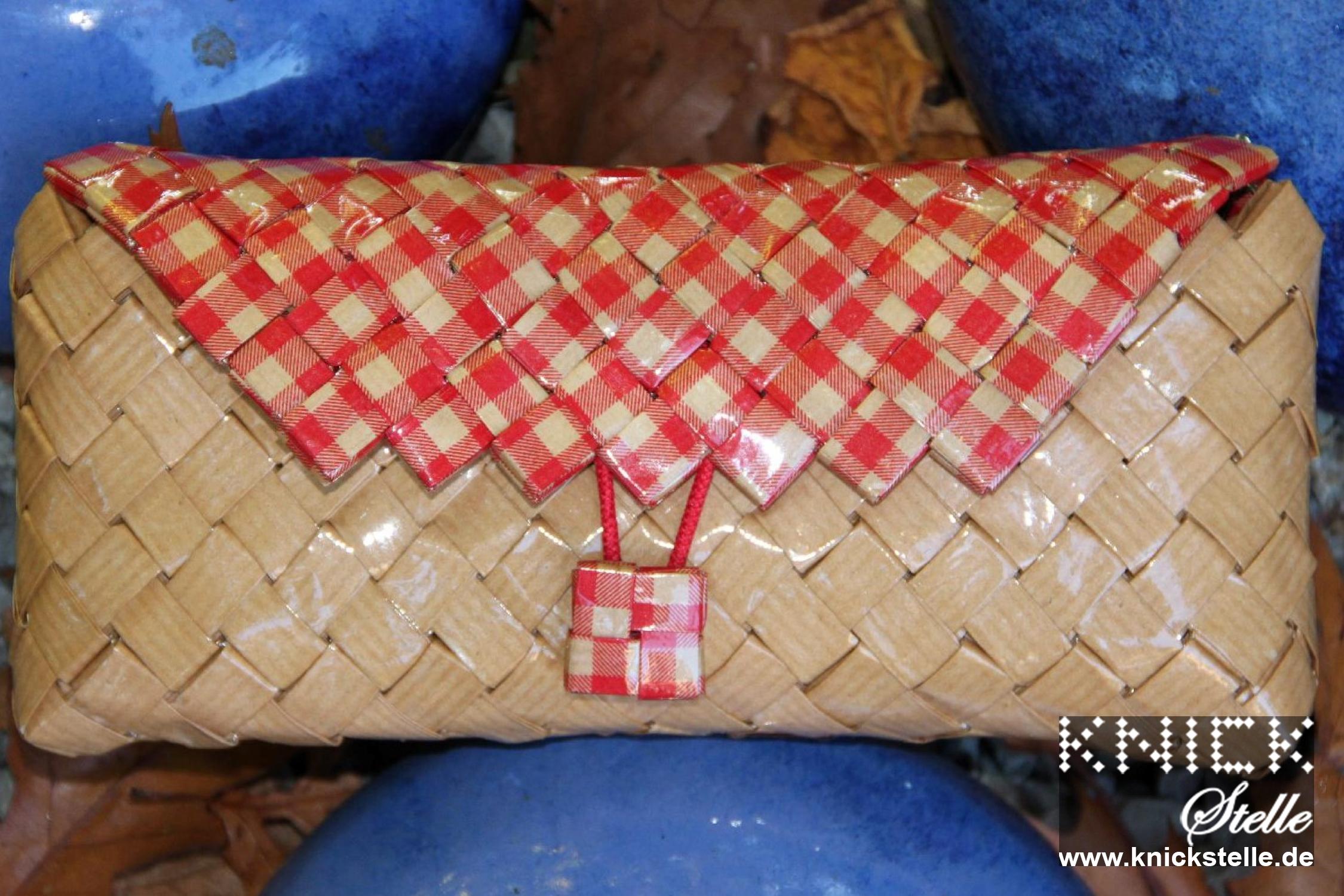 Diese Clutch erinnert etwas an ein leckeres Picknick an einem schönen Sommertag. Der Deckel und der Knopf sind in rot-braun kariertem Papier gearbeitet, während der Korpus aus braunem Packpapier besteht. Dies unterstreicht ihre Form. Die Clutch ist mit einer braunen/ antik-bronzenen Trägerkette versehen.