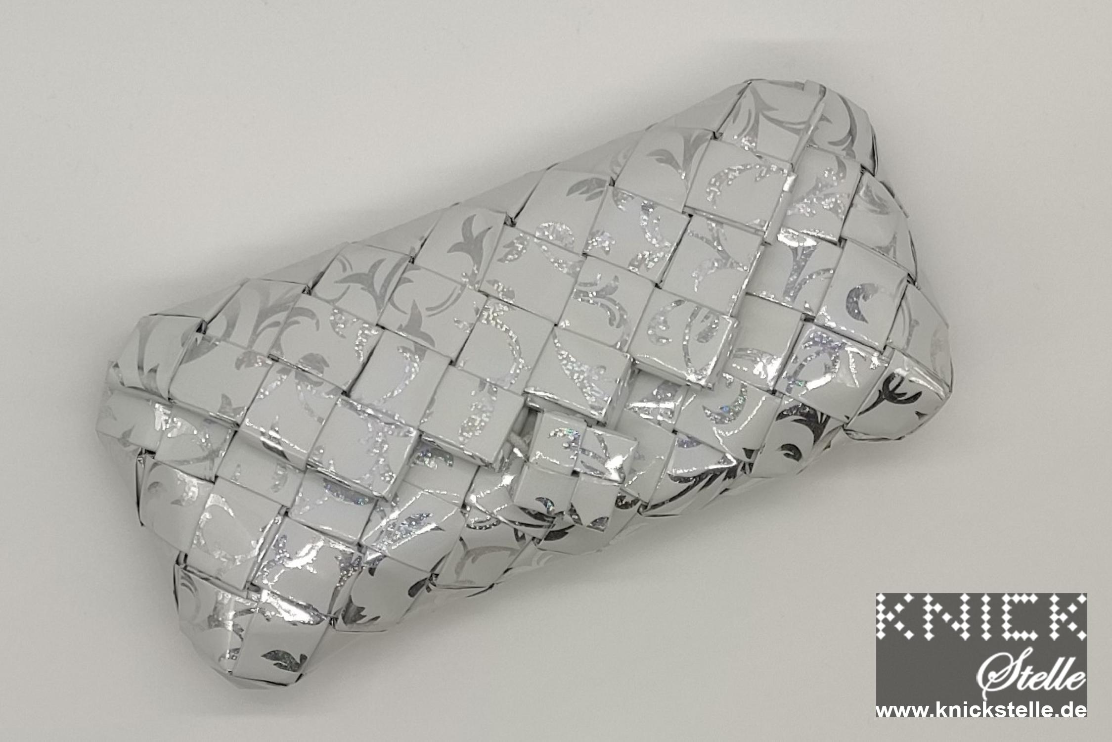 Sehr edel und festlich wird diese Clutch durch ihre Kombination aus weißem Hintergrund mit silbernen Holografie-Ranken. Aber trotzdem lässt sie sich auch zu jedem Party-Outfit kombinieren und ist ein absoluter Allrounder. Natürlich ist sie passend zu dem silbernen Holografie-Muster mit einer silbernen Trägerkette versehen.