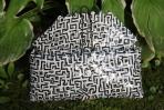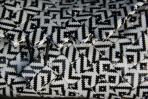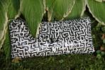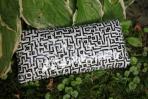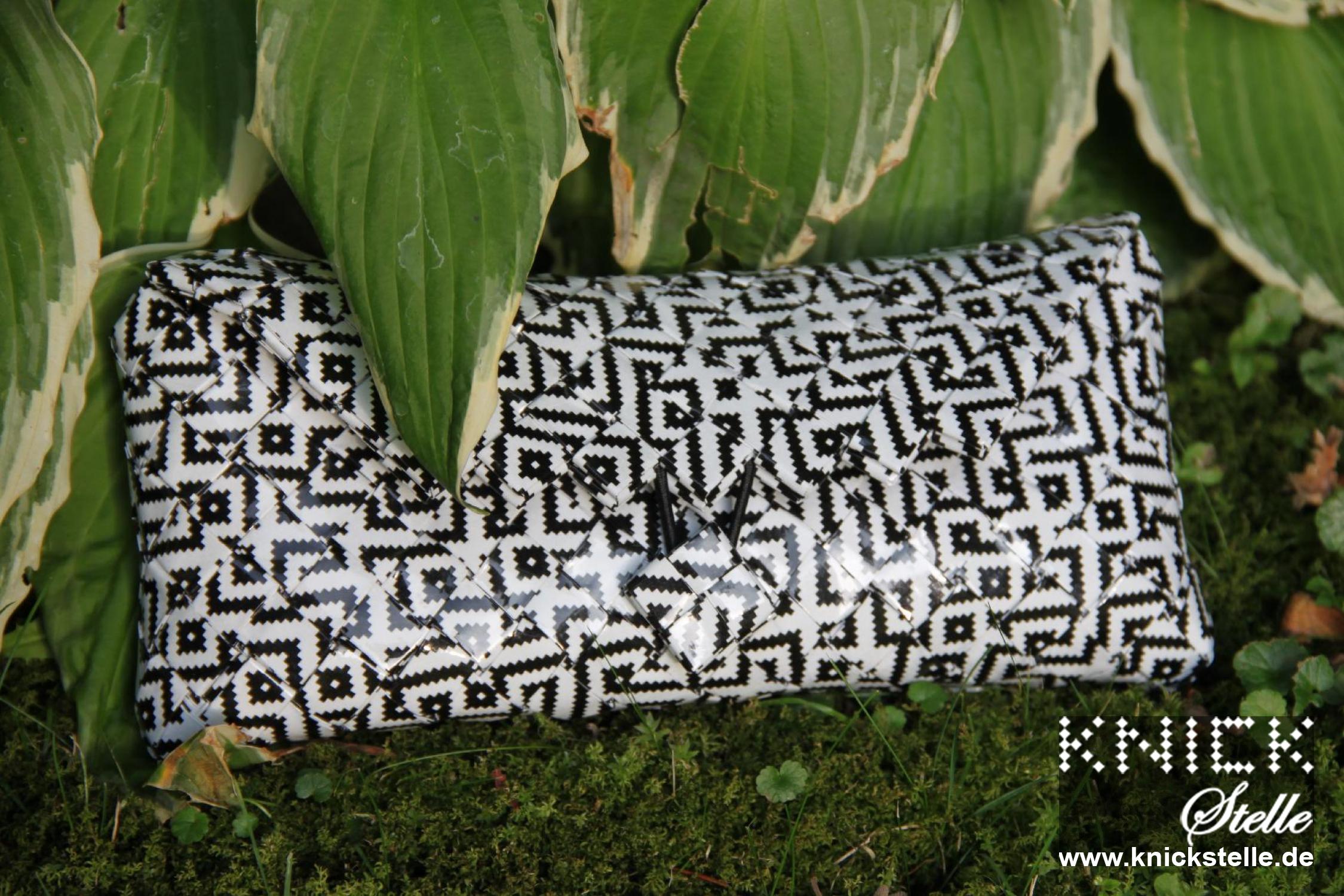 Eine klassische Clutch mit schwarz-weißem Muster. Durch die Falttechnik wirkt es so, als ob ein Layrinth auf die Clutch gemalt wurde. Die Clutch hat eine schwarze Trägerkette.