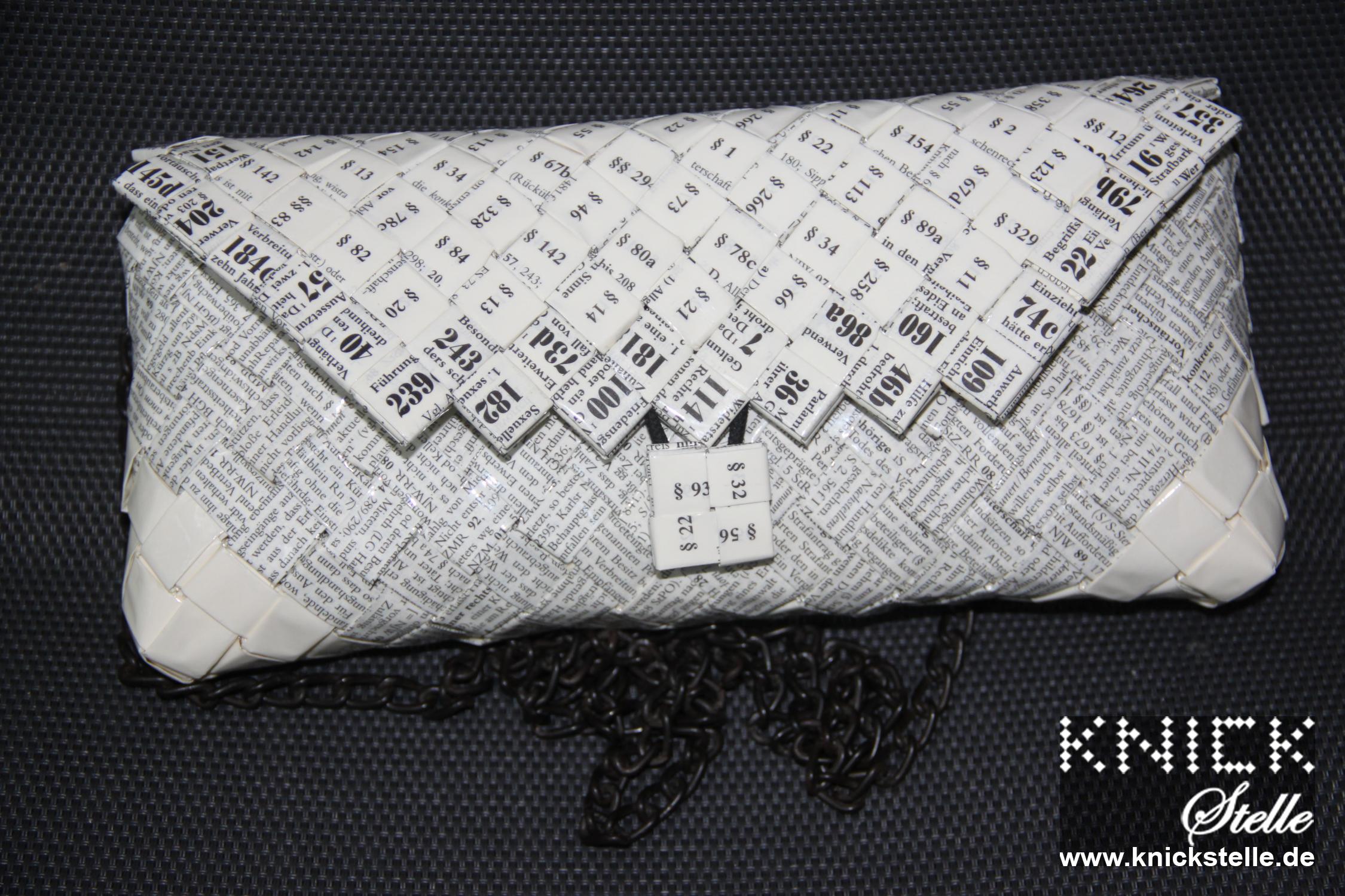 Diese Clutch wurde aus den eigenen Gesetzestexten erstellt. Auf dem Korpus sieht man die Texte, die Ecken sind mit weißem Papier abgesetzt. Den Deckel ziehen die Paragraphen mit abgesetztem Rand.