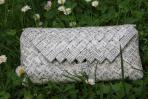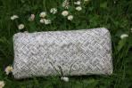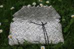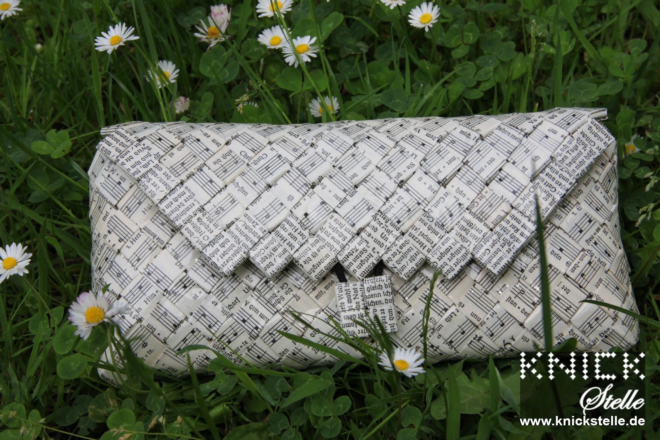 Hier wurde das alte Familiengesangbuch zu einer Clutch verarbeitet. Nach Kundenwunsch wurde das Papier so gefaltet, dass das Motiv überwiegend Noten sind. Nur der Rand des Deckels wurde mit Liedertexten abgesetzt.